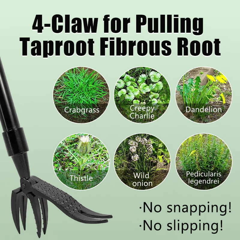 â Pointed Four-claw Design: The four-claw design of the gardening weeding tool can easily penetrate the hard soil, and the anti-slip barb design prevents the grass root from slipping after being caught, ensuring that it will not grow again after one weeding.