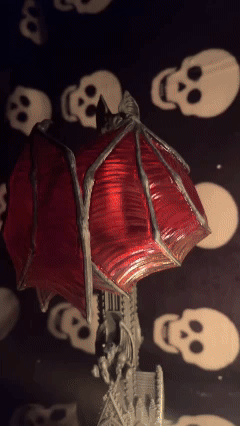 - 🦇 Bat-Wing Lampshade – Vivid red glow mimics candlelight through stretched wings