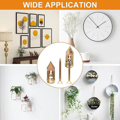 Self-Drilling Anchors Screws features expansion design in the ribbed anchors and tapered sharp head that expands on two opposing sides as you tighten the screw, increasing the holding power. Serrated on both sides to increasing the metal anchors hanging power up to 66lbs. Work great on hanging all kind of item on your home decor, such as picture frame, wall lamp, curtains, clock, plants, etc.