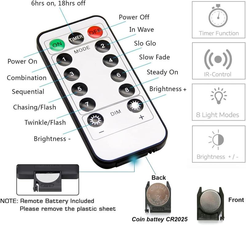 🎛️Timer Remote: Control the lights with the wireless remote and choose from 8 different flash modes, including combination, in waves, sequential, slogs, chasing/ flash, slow fade, twinkle/ flash, and steady on. Plus, activate the timer to automatically turn the lights on for 6 hours and off for 18 hours every 24 hours.