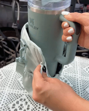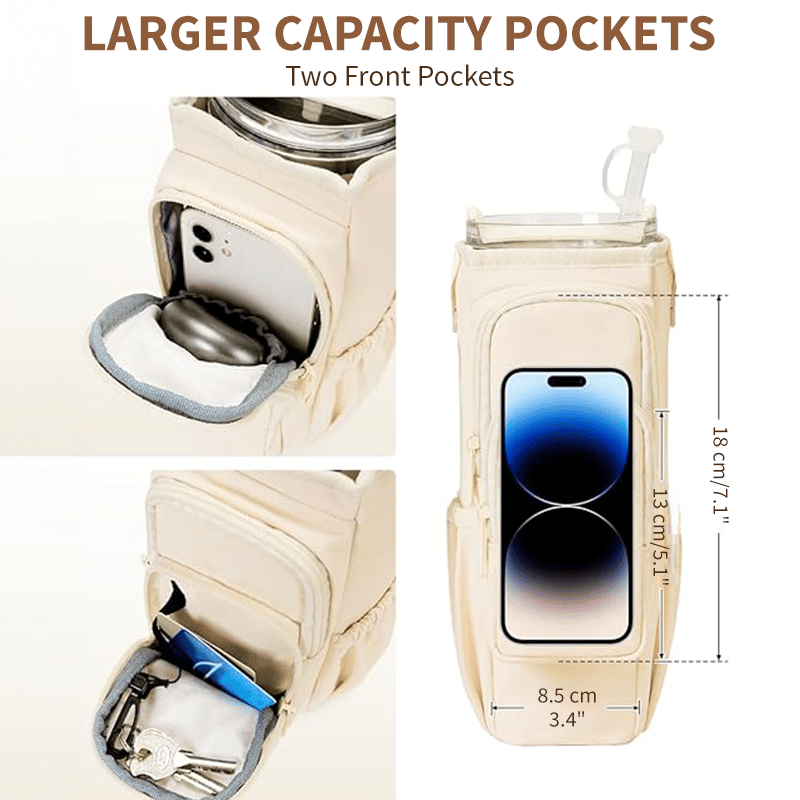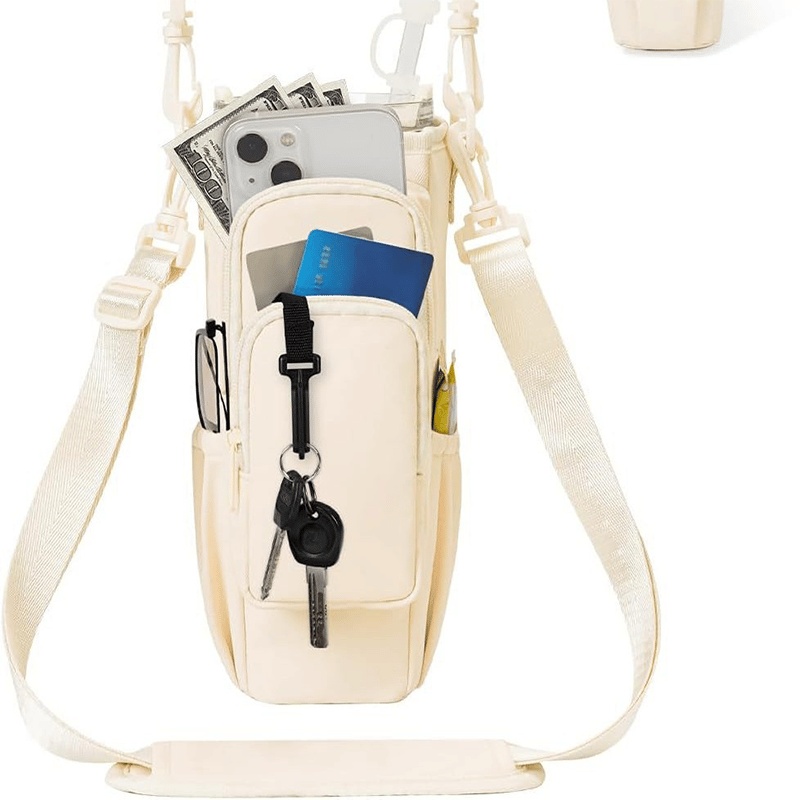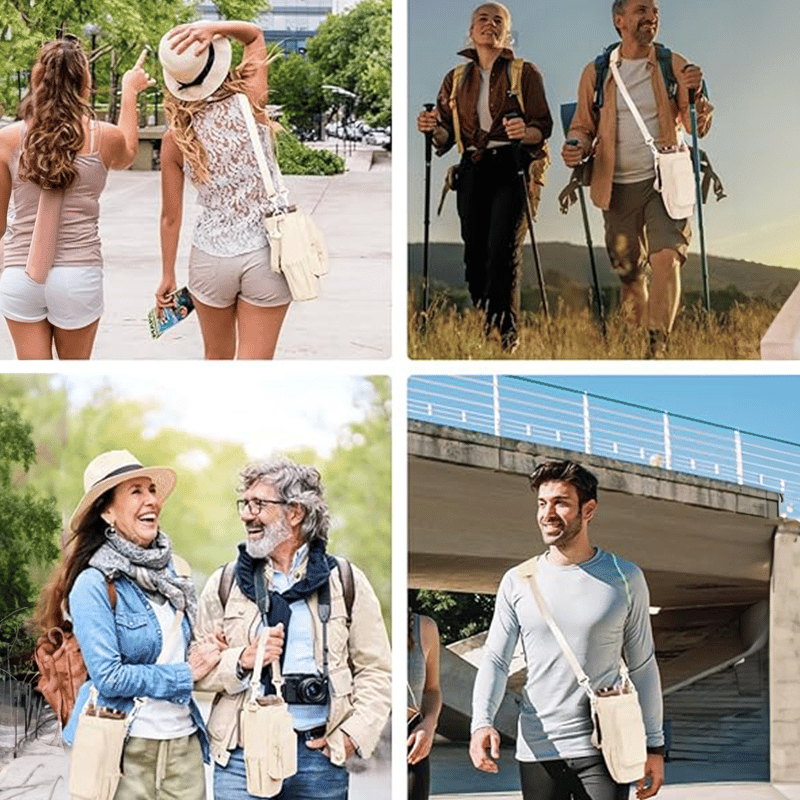 Equipped with a Velcro bottle holder and an adjustable shoulder strap, it's easy to carry by hand or across the body, eliminating the hassle of carrying a water bottle.