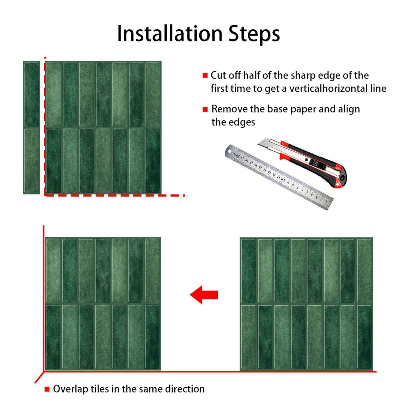 No grout, no glue, and no special tools required. Simply clean the wall, cut tiles as needed, peel off the backing, interlock, and stick. It's that simple!